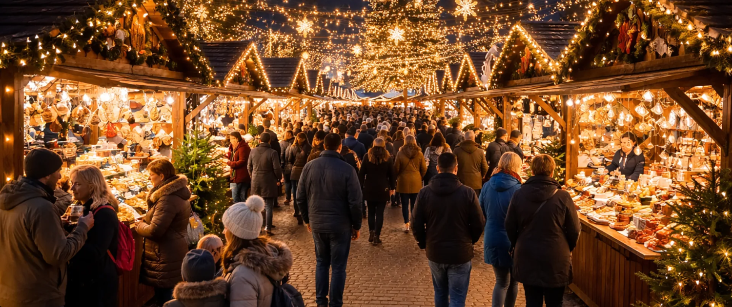 Entre les façades historiques de la vieille ville, plus de 70 chalets de marché accueillent une foule de visiteurs durant les festivités de Noël